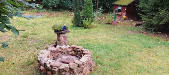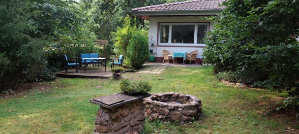 Der Gartenbereich vor dem Wohnzimmerfenster mit kleiner Feuerstelle und Kinderhäuschen!