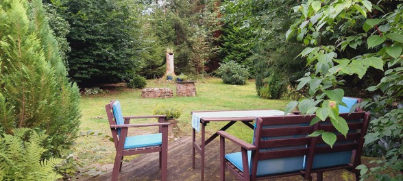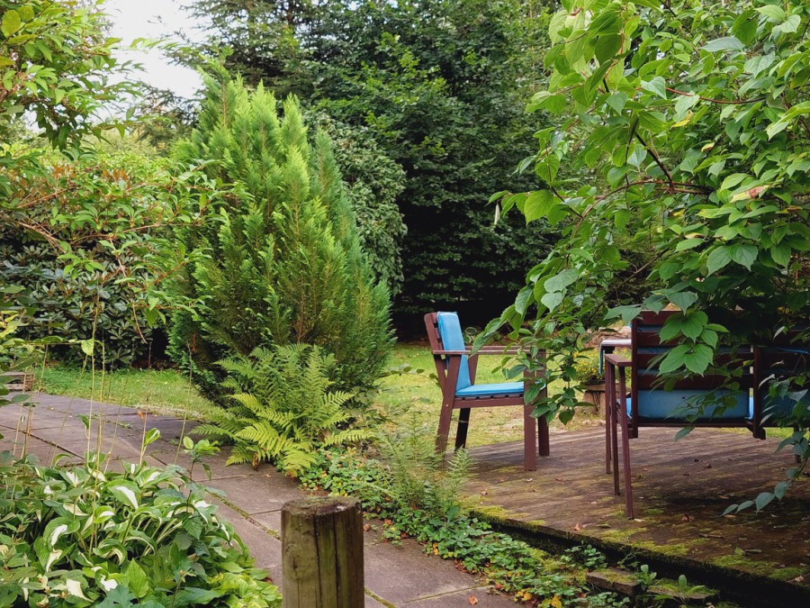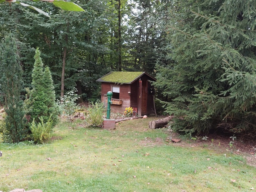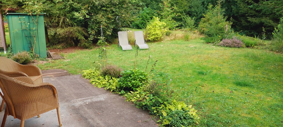 Ein gr0ßer Garten mit teilweise großen alten Bäumen wartet darauf, entdeckt zu werden. Verschiedene Sitzbereiche und eine kleine Feuerstelle sind vorhanden. Ein kleines Holzhaus wartet darauf, von den Kindern bespielt zu werden.
