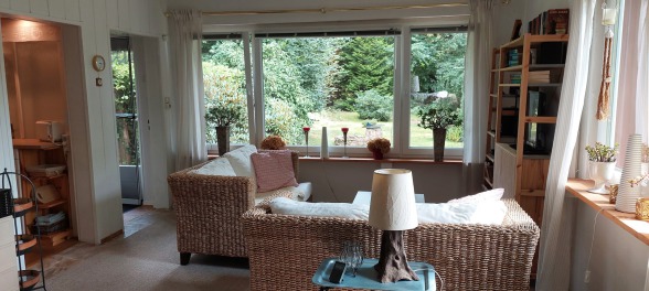 Die Sofaecke mit zwei Korbsofas vor dem großen Fenster mit Blick in den Garten!