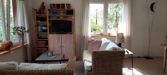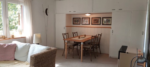 Den Wohnraum haben wir mit gemütlichen Möbeln zweckmäßig eingerichtet. Ein Eßtisch bietet 4-5 Personen Platz. Einige Bücher, ein kleiner Fernseher mit DVD-Player und eine Musikanlage stehen zur Verfügung.