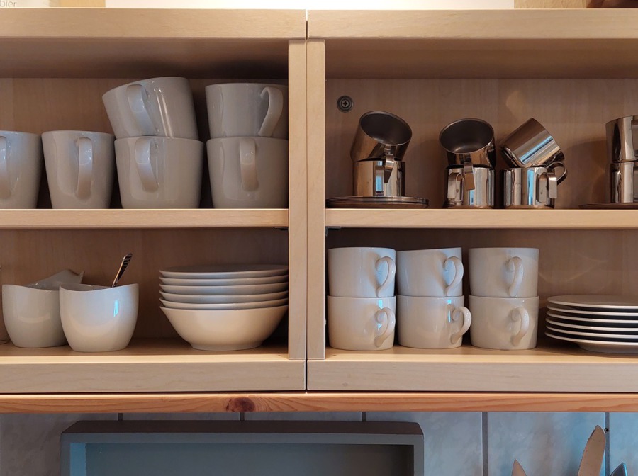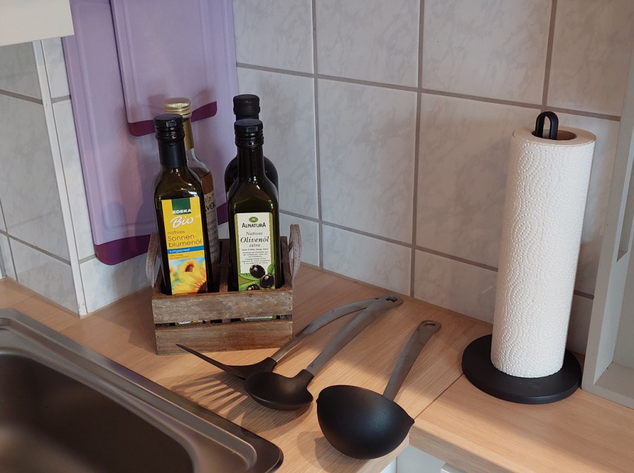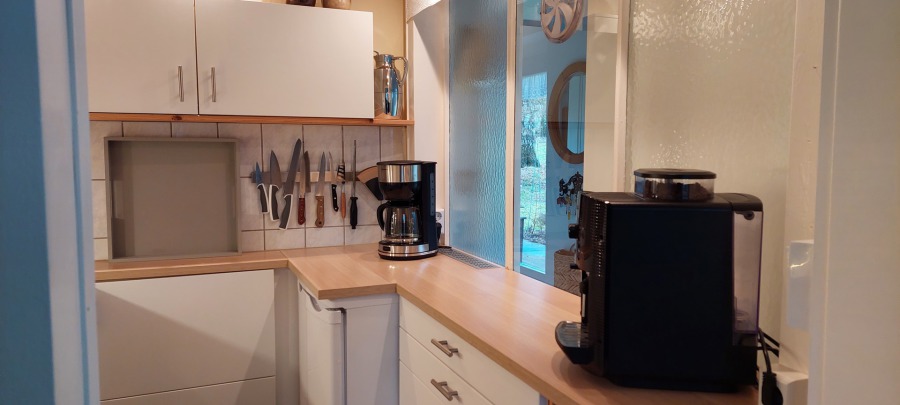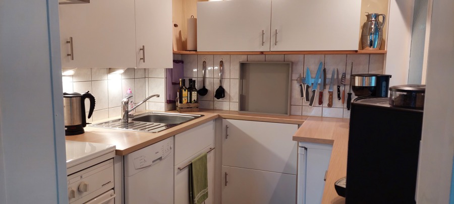 Wie alle unsere Küchen ist auch die Küche in unserem Gästehaus komplett ausgestattet. Gewürze, Öle und Essigsorten, Kaffee und Tee, Zucker, Filtertüten, etc. sind vorhanden. Spültücher, Trockentücher, Spülmittel sowie Taps für die Spülmaschine gehören zur Ausstattung.