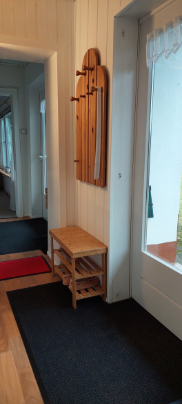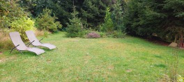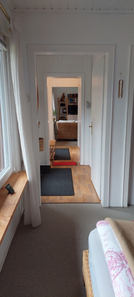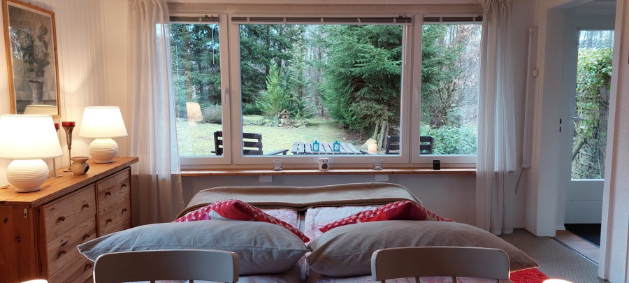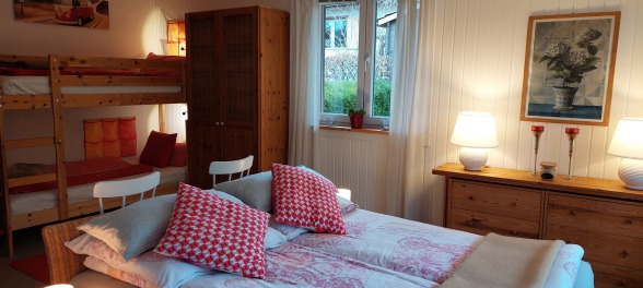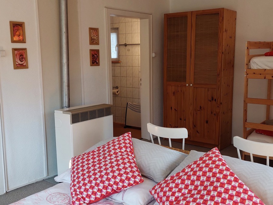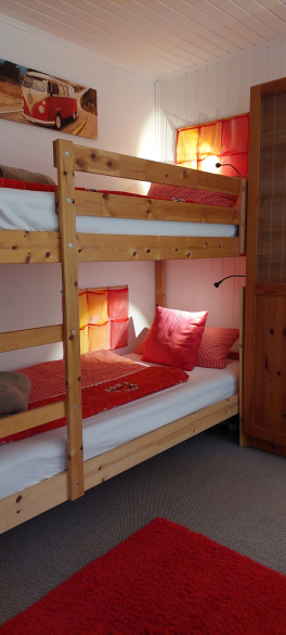 Im Schlafzimmer steht vor dem großen Fenster mit Blick in den Garten das Doppelbett von 160x200 cm. Am Kopfende sind 2 Stühle, wo Sie Ihre Sachen ablegen können. Das Stockbett ( 90x200 cm Liegefläche) bietet 2 kleinen oder großen Kindern Platz. 2 Kleiderschränke bieten Stauraum für Kleidung.
