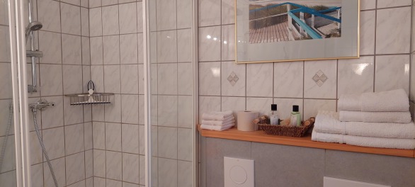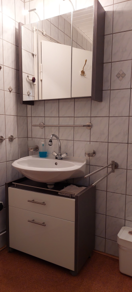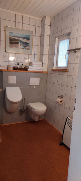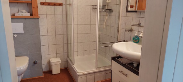 Das Schlafzimmerbad ist mit einem Urinal und einem WC ausgestattet. Ein Waschtisch mit Spiegelschrank bietet Platz für Ihre Waschutensilien. Die Dusche ist Zweckmäßig mit einer Glasschiebetür abgetrennt.
