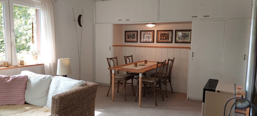 Der Eßbereich mit einem großen Eichenholztisch von 160x80 cm für 4-5 Personen!